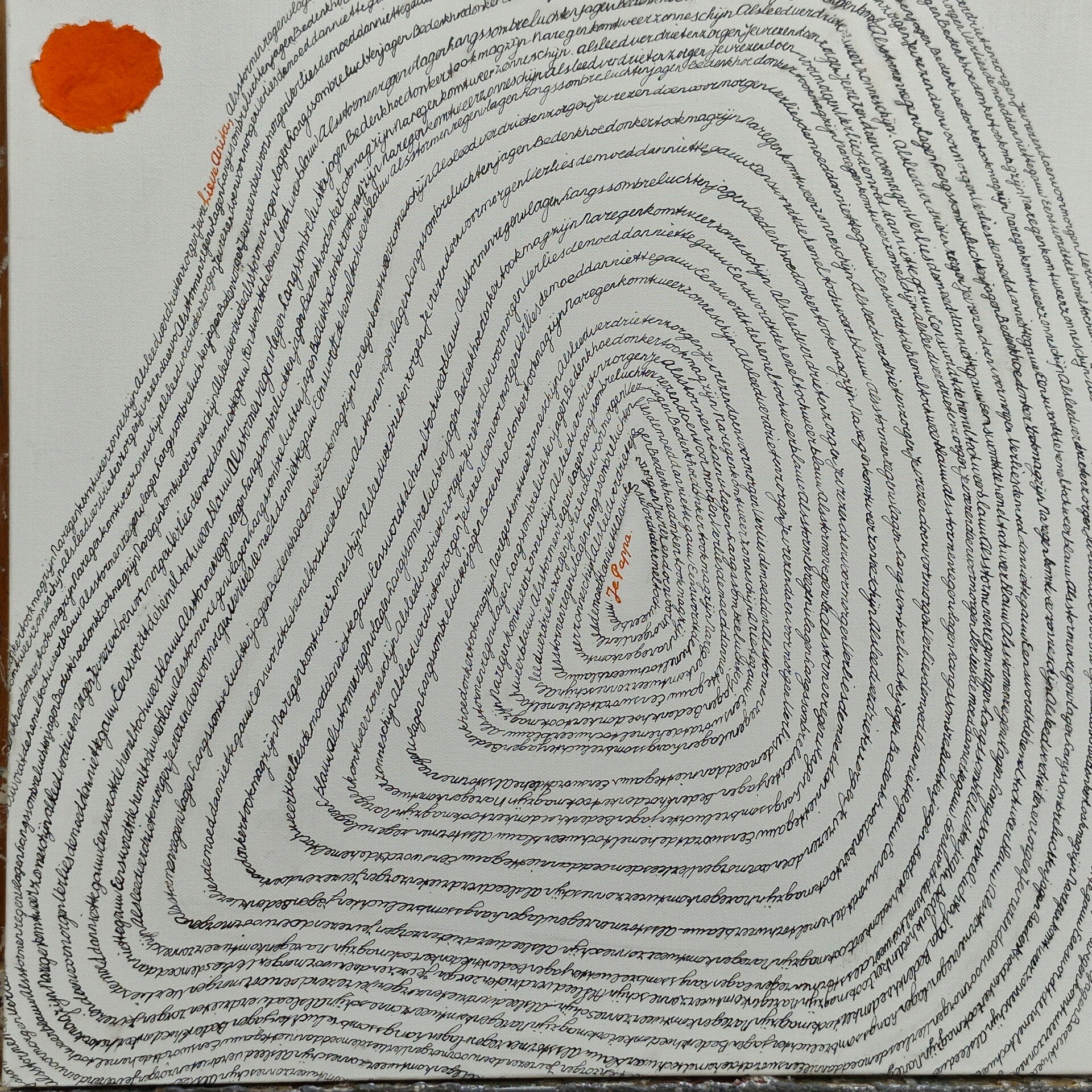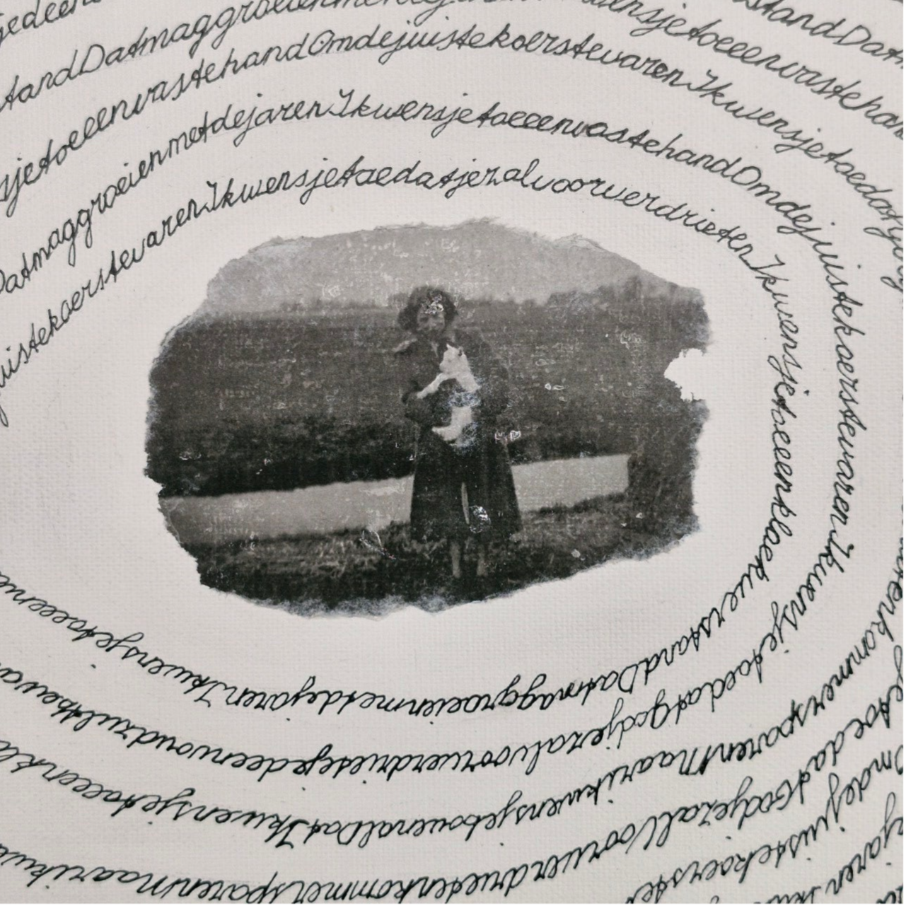 Het gedicht van mijn vader geschreven in mijn poëziealbum heb ik uitgeschreven op canvas met oostindische inkt. Mijn vader tekende graag en maakte werk met de kroontjespen en oostindische inkt. Ik heb geschreven in de vorm van jaarringen om zo de voorbij gegane jaren weer te geven.