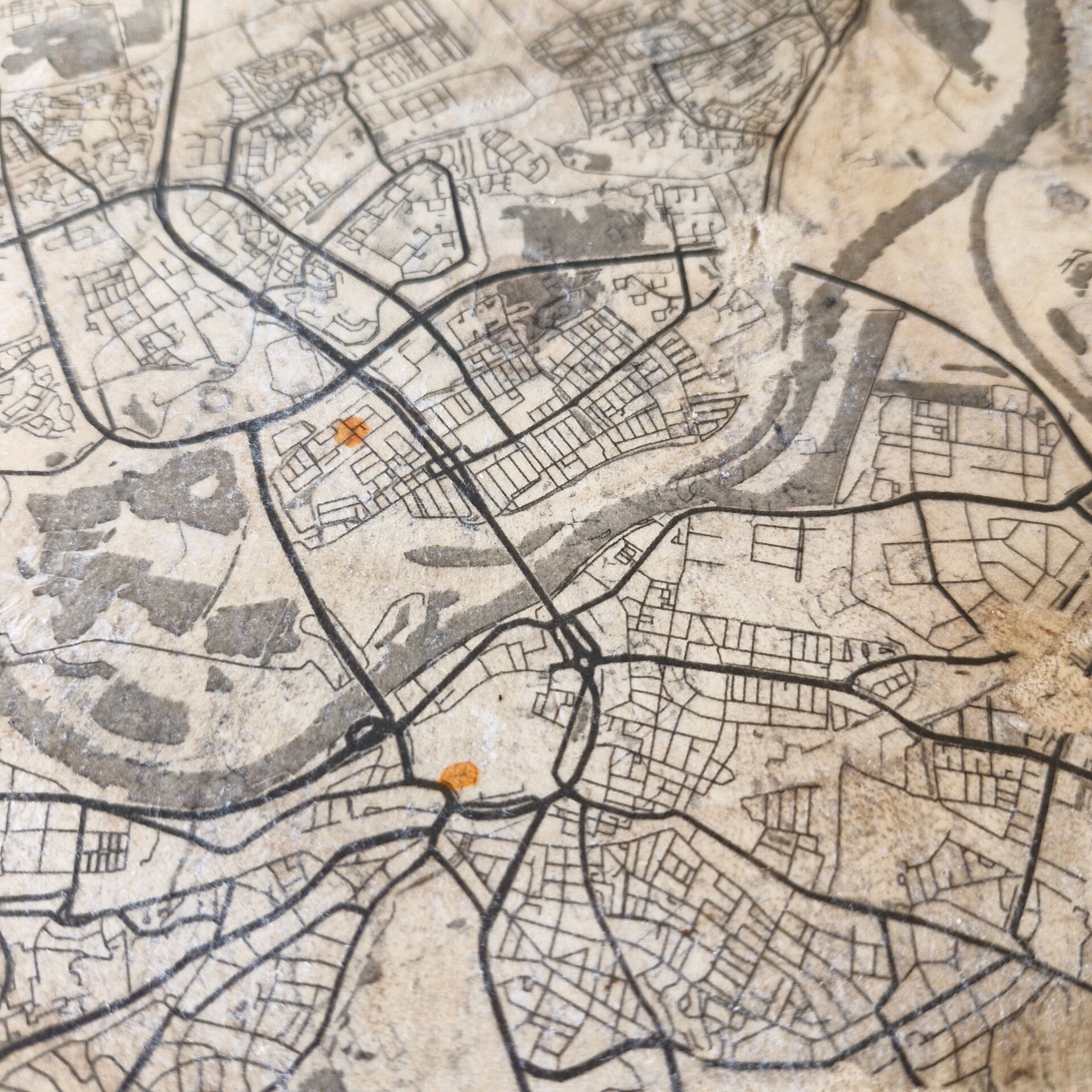 Een gedeelte van de plattegrond van Arnhem gemaakt via fototransfer op de jaarringen van een boomplak. Het laat de verstreken tijd in mijn leven zien, zoals bij een boom te zien is aan de jaarringen, beïnvloed door gebeurtenissen (goede tijden/slechte tijden). Hieronder de boomplak met daarop een jeugdfoto van mijn vader genomen voor een oude landkaart van Zuid-Holland.